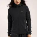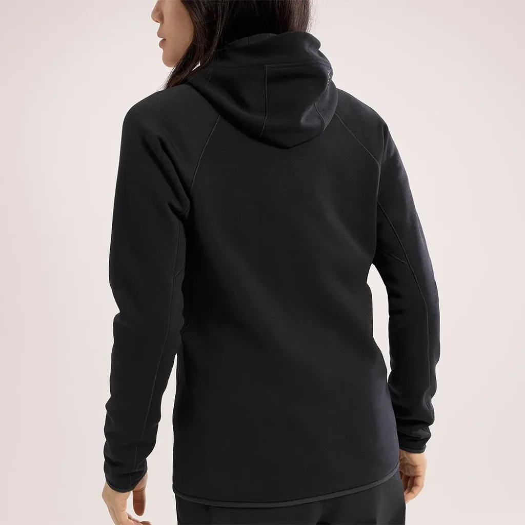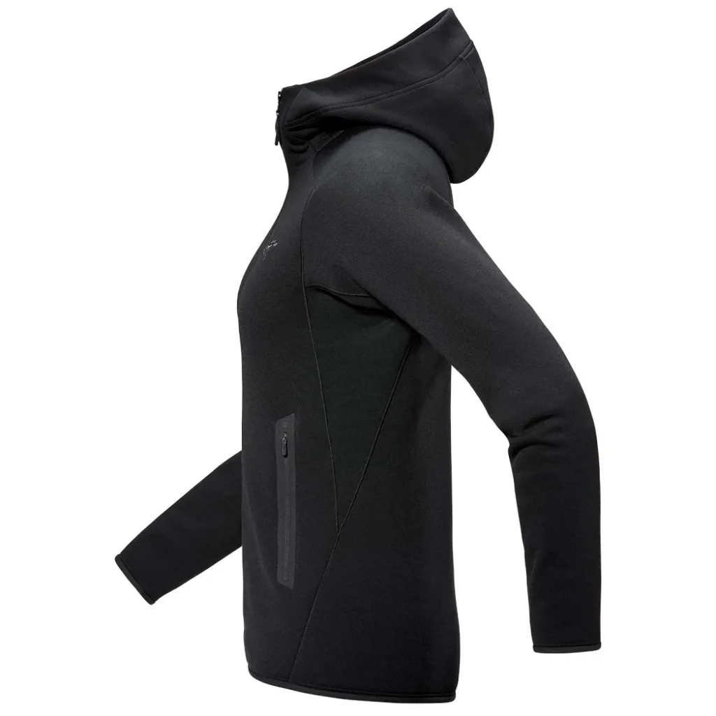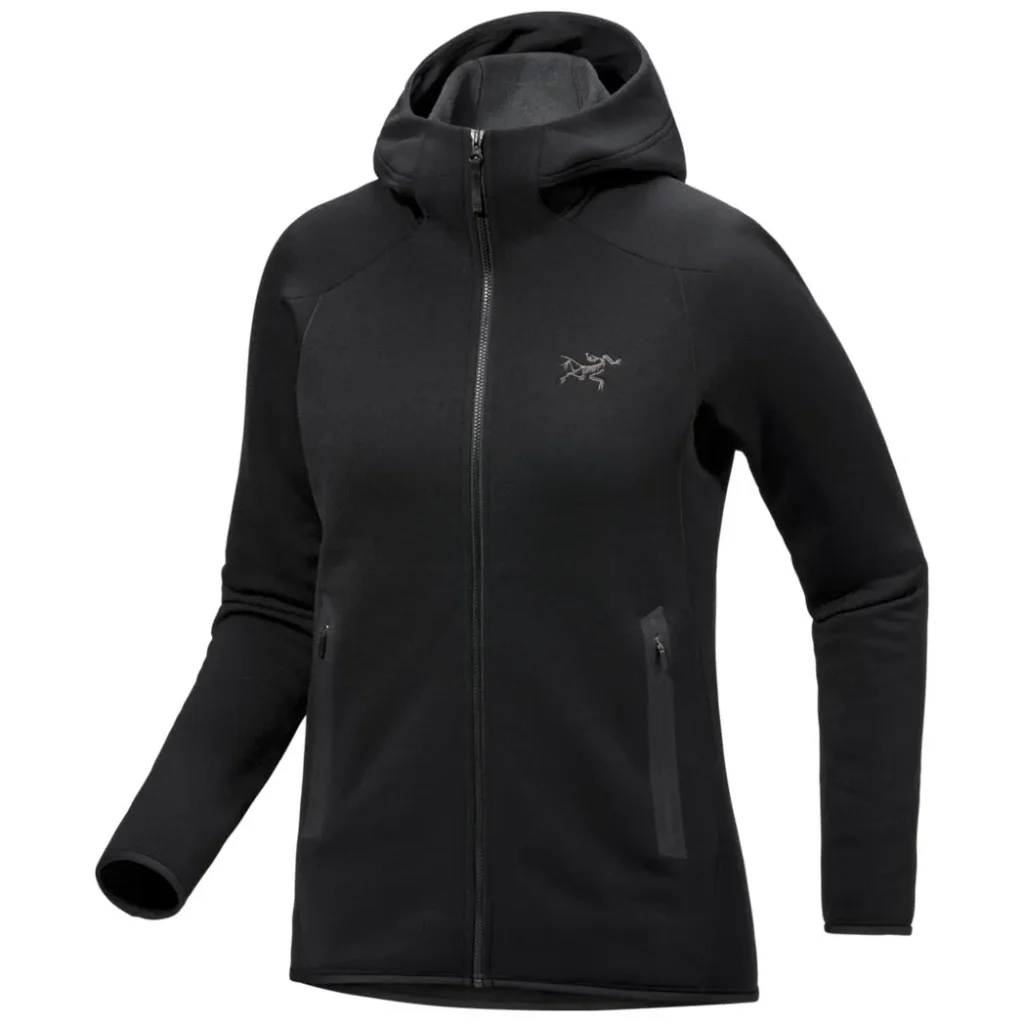 Veste polaire technique femme, la Kyanite Hoody femme Black d’ARC’TERYX allie chaleur, respirabilité et liberté de mouvement grâce à sa construction stretch. Elle s’adresse aux passionnées de randonnée, escalade légère, ski ou vie outdoor urbaine.