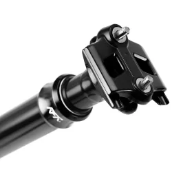 Tige de selle télescopique à réglage continu, conçue pour améliorer l’ergonomie et la performance VTT en ajustant rapidement la hauteur de selle depuis le guidon.