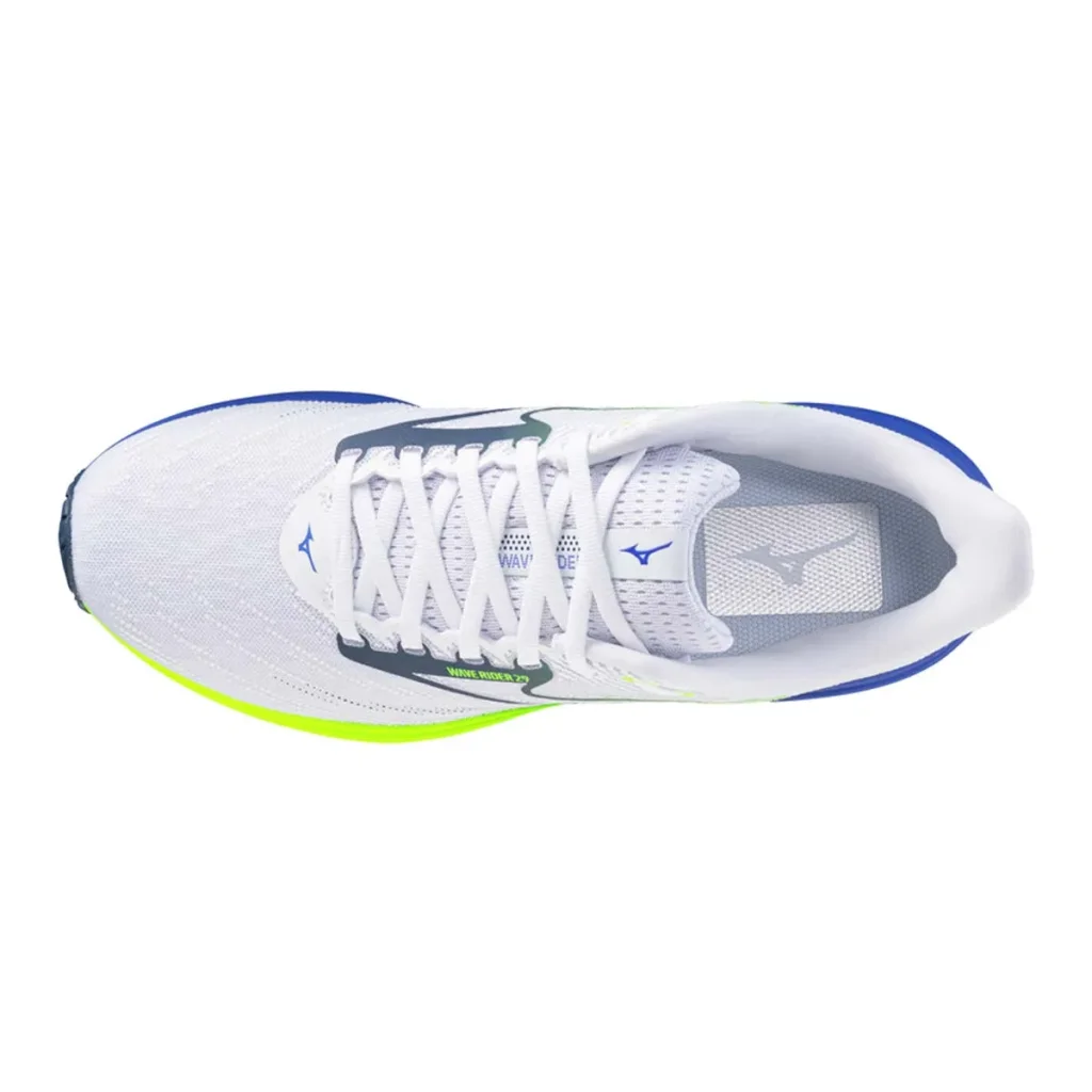 Descriptif MIZUNO Wave Rider 29 /blanc estate bleu clair jaune
