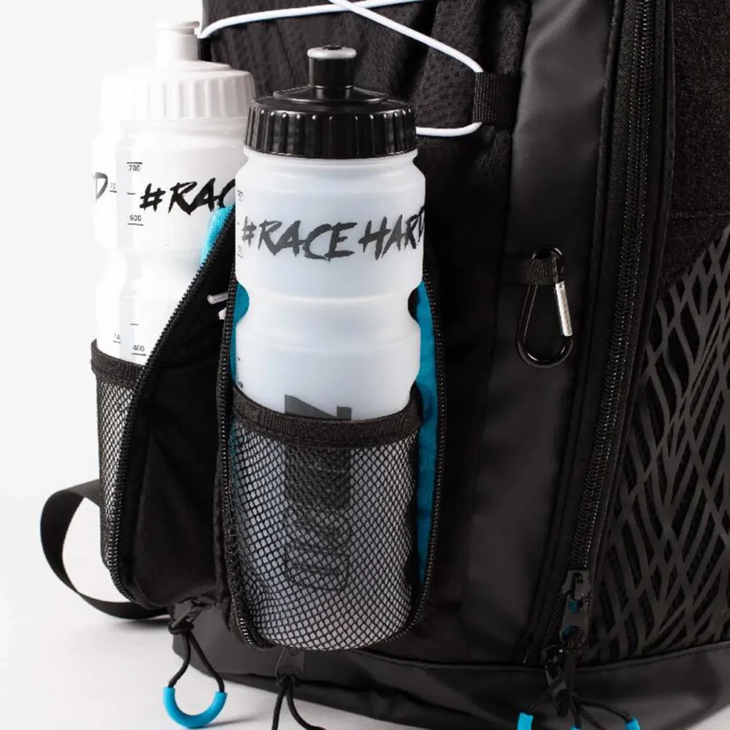 - Double poche latérale : Emplacements à soufflets sur le côté gauche conçus pour transporter deux bidons de 750ml.